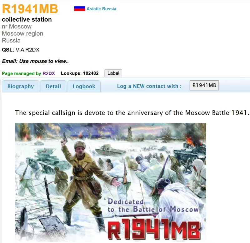 后面我听录像,一遍一遍的听,又结合QRZ去查询,R191MB?一看不是,R19YMB,再一查还是不是,最后基本确定了R1941MB,同时还发到微信群咨询其他朋友,BI4JM赵老师一下子就听出来了,和我对应出来的是一致的,感谢赵老师帮忙确认。当查到这个呼号的时候,还有点不敢相信,竟然是一个莫斯科战役特设电台。心里也是一阵窃喜,竟然又搞到了一个特设电台,而且基本完全是机缘巧合。