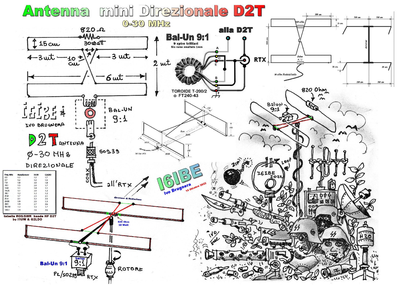 Antenna direzionale compatta D2T, 2 elementi 0-30 MHz, boom 2 mt. radiatori 6 mt. Corta, manegevole, leggera e silenziosa, di derivazione Militare, facilmente atocostruibile, impedenza prossima ai 450 Ohm, occorre solamente un Bal-Un 9:1 ed un Resistore antinduttivo da 820 Ohm 30 watt, ampia documentazione sul web, spaziatura dei dipoli ripiegati 15 cm. Antenna bistrattata e semi sconosciuta alla maggior parte degli OM, il disegno allegato rende l'idea sulle reali dimensioni, parente stretta della T2FD sicuramente vale la la pena provarla, risultato garantito. La criticità del grosso resistore da 820 Ohm 30 Watt si risolve parallelando più resistenze antinduttive (strato di carbone) di piccolo wattaggio.