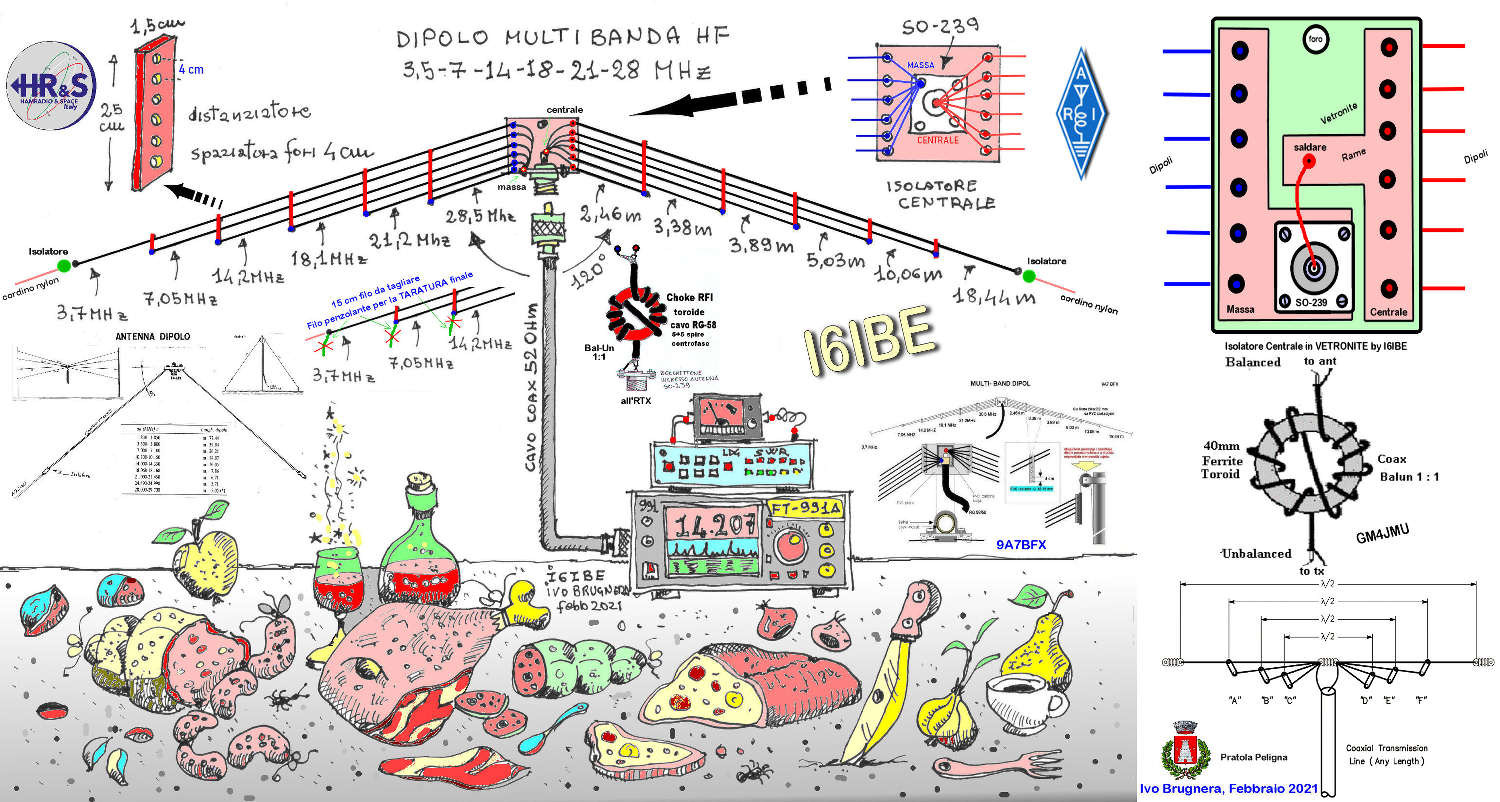La costruzione di un DIPOLO MULTIBANDA per le gamme HF 3,5-7-14-18-21-28- Mhz risulta facilissimo e di sicuro funzionamento, la taratura e' di una facilita' estrema, i dipoli per le varie bande HF sono full-size privi di cariche o bobine che complicano l'accordo. la spaziatura tra i dipoli fa si che non si influenzino tra loro durante la taratura che risulta facile e veloce. Con le misure date vi avvicinerete sicuramente al centro banda per ogni gamma radio operata, piccoli ritocchi per ottenere ROS 1:1,1 accorciando o allungando piccoli STUB di filo alle estremita' qual'ora ce ne fosse bisogno. L'inclinazione di 120° dei bracci rende l'IMPEDENZA dell'antenna dipolo prossima ai 52 Ohm, posizionandolo ORIZZONTALE l'impedenza arriva a 75 Ohm, 150° 70 Ohm o a 90° per 35 Ohm. Per la costruzione occorre solamente normale filo elettrico da 2 mm, il centrale (isolatore) lo realizzate facilmente con una basetta di VETRONITE da 1,5 mm, volendo potete aggiungere un BAL-UN 1:1 o Choke RFI ad evitare probabaili rientri di RF, realizzato facilmente avvolgendo cavo coassiale 52 Ohm 5+5 spire controfase, su un toroide simil T-200 Amidon. In fondo una tabella di I1WSM relativa al fattore di allungamento o accorciamento in cm di un dipolo per farlo risuonare nella banda voluta. Buon divertimento 73 de Ivo I6IBE febbraio 2021