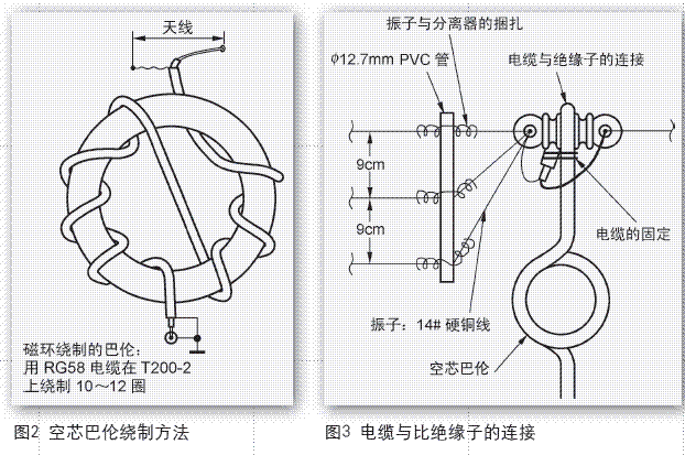 如果第一次尝试架设D.P天线的 话,建议购买成品巴伦BU-50等。 磁 环 选 用 外 径 4 5 m m 、 内 径 25mm、 厚8mm、导磁率m为60以上 的国产或者进口磁环均可。如图2所 示,用RG-58的优质50Ω铜轴电缆正 反绕制12圈形成。当然您也可以用直 径0.9~1.2mm漆包线三线绞合,在磁 环上绕6~8圈(具体制作略)。或者 用同轴电缆绕制空芯巴伦3.5~30MHz (这种绕制方法的圈数多少并不重 要,关键是电缆的长度)。具体制作 方法见图2。
