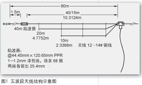 1/2波长双极天线(Dipole,简称 D.P天线)是最为常见短波天线之 一,也是其他天线的基础。因为其构 架简单,调试容易,成功率高,得到 了HAM们的广泛推崇。由于居住环境 的限制,在没有条件安装大型、多波 段定向天线的情况下,简单的D.P天线 成为了爱好者架设天线的首选,初学 者一般都是从单波段D.P天线开始入手 ON AIR(通联)。在获得与国内外爱 好者通联的成就感之后,大家可能最 先想到的就是如何增加波段,或者改 造现有的单波段天线,拓展天线的覆 盖频段,以适应不同级别的频率操作 范围。本文就为大家介绍一种拓展了 频率范围的5波段偶极天线,可工作 于80m、40m、20m、15m、10m五个 波段。该天线的特点是,占用空间相 对较小,DIY容易,适合爱好者制作。 天线设计的宗旨:尽量少用Trap(陷波 器 )或者缩短线圈;尽量水平架设; 尽量不用扇形结构,从而减少占用空 间,减少对天线辐射仰角和方向的相 互影响,提高天线的辐 射效率。因 此,改天线只用一个7MHz的陷波器, 10m、20m、40m为自然谐振,15m 为40m三次倍频自然谐振;80m单独 架设实在太长,因而加入了陷波器, 比原尺寸缩短了许多。
