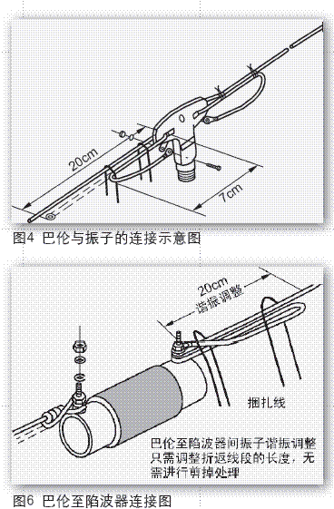 为了在40m振子上增加80m波段, 天线使用了陷波器,因此巴伦与陷波 器之间的振子连接有一个中间的过 渡,与10m、20m单一振子连接有所不 同。这种结构的目的同样是为了便于 天线修剪,天线谐振频率的调整,不 需要剪短(掉)天线。其方法是:天 线振子穿过陷波器连接孔(螺丝), 然后沿振子返回来,最后用螺栓固定 在陷波器上,见图6。