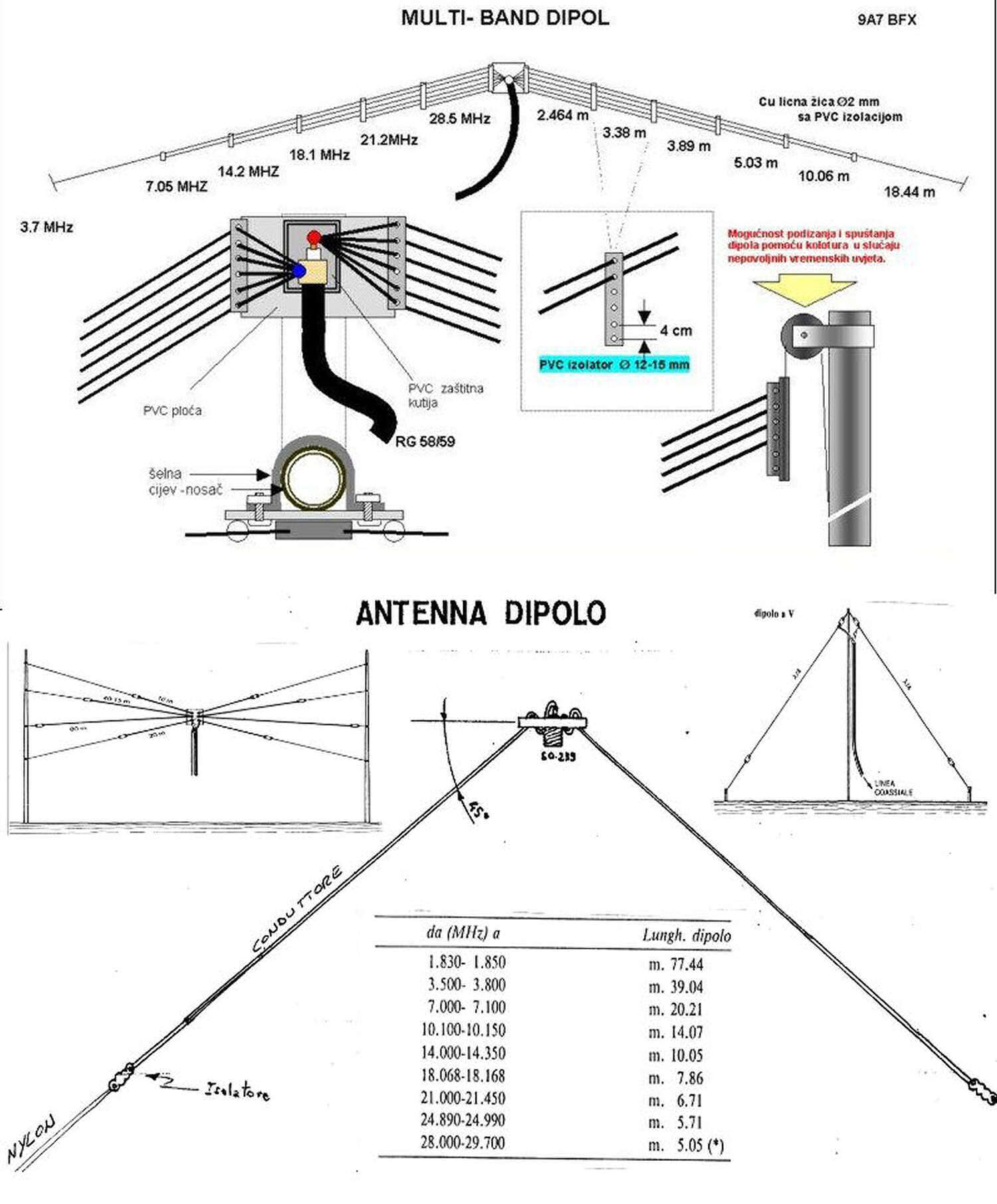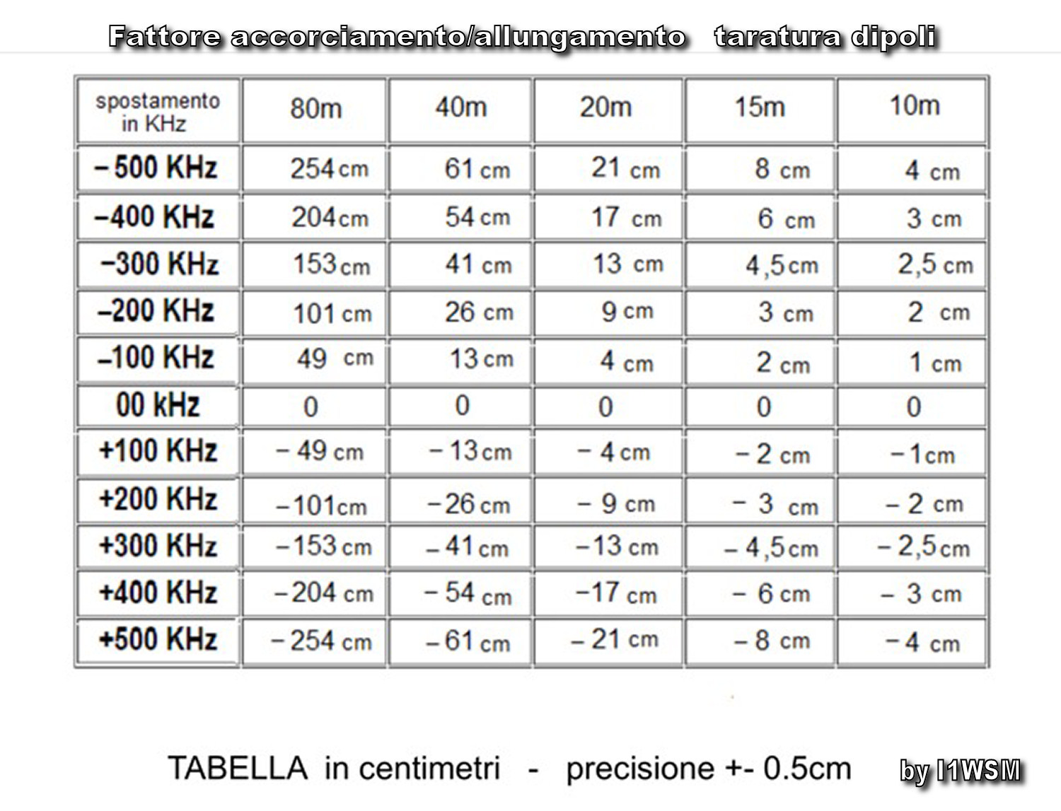 La costruzione di un DIPOLO MULTIBANDA per le gamme HF 3,5-7-14-18-21-28- Mhz risulta facilissimo e di sicuro funzionamento, la taratura e' di una facilita' estrema, i dipoli per le varie bande HF sono full-size privi di cariche o bobine che complicano l'accordo. la spaziatura tra i dipoli fa si che non si influenzino tra loro durante la taratura che risulta facile e veloce. Con le misure date vi avvicinerete sicuramente al centro banda per ogni gamma radio operata, piccoli ritocchi per ottenere ROS 1:1,1 accorciando o allungando piccoli STUB di filo alle estremita' qual'ora ce ne fosse bisogno. L'inclinazione di 120° dei bracci rende l'IMPEDENZA dell'antenna dipolo prossima ai 52 Ohm, posizionandolo ORIZZONTALE l'impedenza arriva a 75 Ohm, 150° 70 Ohm o a 90° per 35 Ohm. Per la costruzione occorre solamente normale filo elettrico da 2 mm, il centrale (isolatore) lo realizzate facilmente con una basetta di VETRONITE da 1,5 mm, volendo potete aggiungere un BAL-UN 1:1 o Choke RFI ad evitare probabaili rientri di RF, realizzato facilmente avvolgendo cavo coassiale 52 Ohm 5+5 spire controfase, su un toroide simil T-200 Amidon. In fondo una tabella di I1WSM relativa al fattore di allungamento o accorciamento in cm di un dipolo per farlo risuonare nella banda voluta. Buon divertimento 73 de Ivo I6IBE febbraio 2021